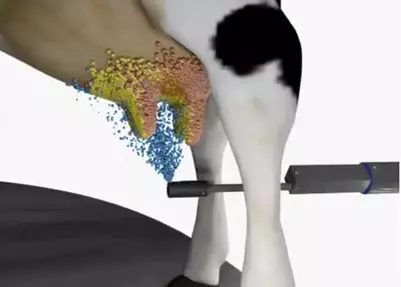 Thorough teat spray coverage of all four teats is achieved with the use of two independently controlled spray nozzles that extend under the cows’ udder as the rotary platform passes.